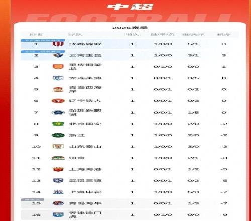 中超最新積分榜出爐!成都蓉城穩坐領頭羊,首輪打完僅三隊有積分