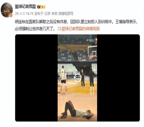 胡金秋回國后,本來可以休息幾天(上海國手李弘權就獲準長假),但是大秋國家隊解散后,馬上投入集訓。據籃球記者賈磊透露,“胡金秋在國家隊解散之后沒有休息,回到隊里立刻投入到訓練中。王博指導表示,必須強制讓他休息幾天了”。顯然勤奮的胡金秋是拒絕了王博的要求,沒有休息。從視頻看到,胡金秋回到俱樂部后,立刻就訓練,有兩人陪他訓練,如此勤奮,也怪不得他的技術這么好。