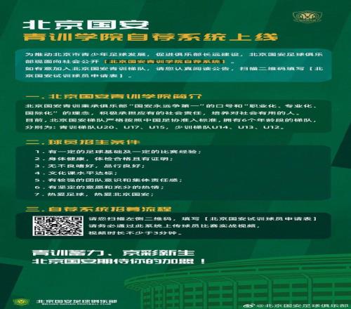 你行你上,北京國安面向社會公開青訓學院自薦系統 懂球帝 2026-03-06 18:01:05 北京時間3月6日,北京國安官方發布公告,俱樂部面向社會公開青訓學院自薦系統,為梯隊招募球員。球員招生條件1.有一定的足球基礎及一定的比賽經驗;2.身體健康,體檢合格且有證明;3.無不良嗜好,品行良好;4.文化課水平達標;5.有較強的團隊意識和集體責任感;6.有堅定的意愿和充分的熱情;7.熱愛足球,熱愛北京國安;足球免費觀看_青訓學院免費觀看_你行你上免費觀看_足球高清在線_青訓學院高清在線_你行你上高清在線 足球 青訓學院 你行你上 北京國安 上一篇: 申花門前站個薛慶浩,斯坦丘遠射有準頭大連客場爭1分8新援首秀 下一篇: 火星撞地球!武漢三鎮新陣VS北京國安重構,誰先沖破磨合困局
