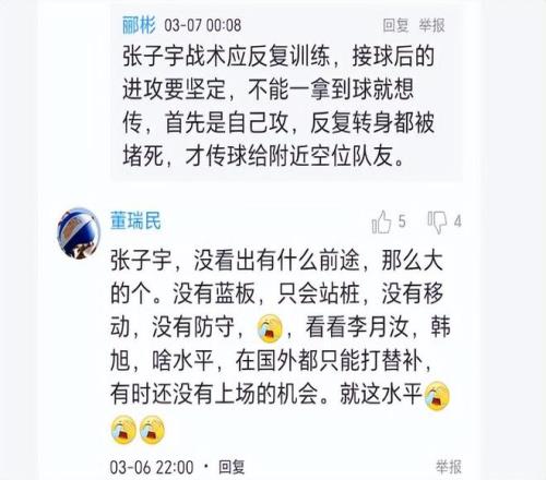 昨晚她與同位置的劉禹彤打的時(shí)間一樣多的13分鐘,但她的得分比劉禹彤少6分,籃板比劉禹彤少4個(gè),而失誤卻比劉禹彤多了3個(gè)。張子宇在場(chǎng)對(duì)球隊(duì)傷害很大,特別是下半場(chǎng)張子宇在場(chǎng)時(shí),拖累了中國(guó)隊(duì)的攻防體系!第四節(jié)上半段打得太難看了,她目前水平還未達(dá)到國(guó)家隊(duì)要求。最近兩場(chǎng)熱身賽她都被劉禹彤搶了風(fēng)頭。