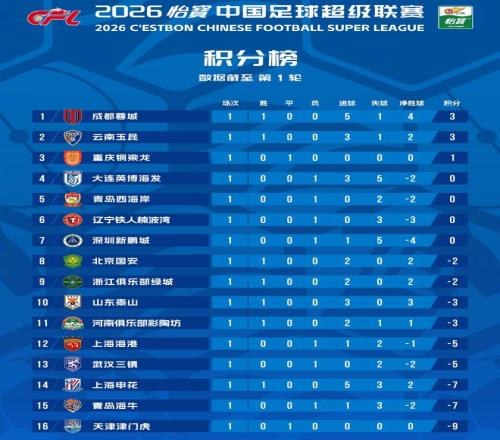3月8日晚,伴隨著北京國安客場2-0完勝武漢三鎮,2026賽季中超首輪戰罷。賽后,中超官方發布了積分榜。