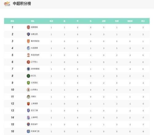 2026賽季中超聯(lián)賽積分榜(截至3.8)