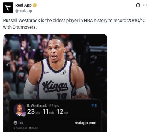 紀(jì)錄一:37歲116天的威少打破馬特-巴恩斯在36歲零2天時(shí)創(chuàng)造的紀(jì)錄,成為NBA歷史上單場交出至少20分10板10助0失誤最老的球員;