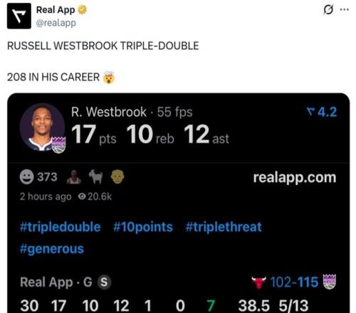 紀(jì)錄二:本場是威少35歲之后第10次轟下三雙成功比肩詹姆斯,成為NBA歷史上唯二做到這一點(diǎn)的球員,其中詹姆斯以35次斷層領(lǐng)跑。