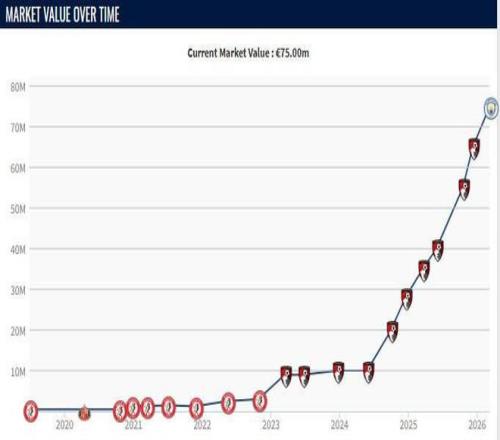 2024年5月時他的身價為1000萬歐元,同年10月上漲至2000萬歐元,12月,他的身價上漲800萬歐元,達到2800萬歐元,之后分別上漲至3500萬歐、4000萬歐、5500萬歐和6500萬歐。
