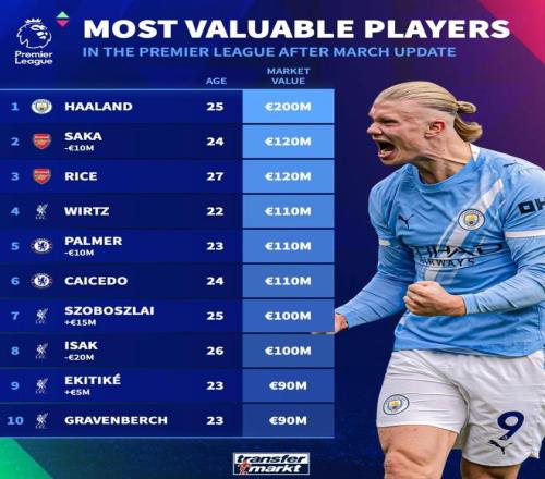 北京時間3月9日,在更新了英超球員的身價之后,德轉還統計出了此次更新后英超身價最高的10名球員,哈蘭德繼續以2億歐元高舉第一,身價下跌1000萬歐元的薩卡以1.2億歐元與隊友賴斯并列第二。