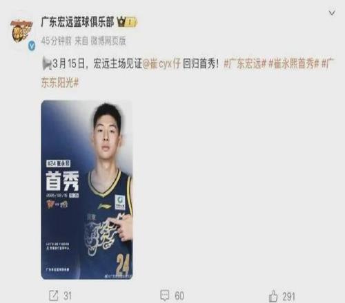 廣東隊官宣:崔永熙將在本月15日完成復出首秀。