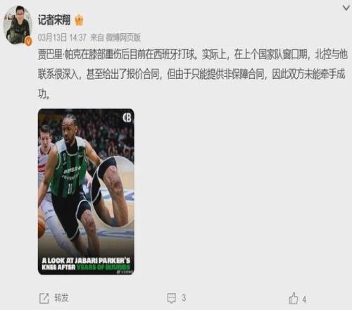據國內知名籃球記者報道:北控隊前不久與賈巴里-帕克深入接觸,然而因為只能提供非保障合同,雙方最終未能達成合作。