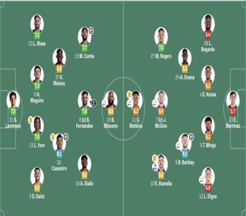 維拉(4231):23-馬丁內斯;26-博加德,4-孔薩,5-明斯,12-迪涅;6-巴克利,24-奧納納;7-麥金(61’31-拜利),27-羅杰斯,10-布恩迪亞;11-沃特金斯(61’18-亞伯拉罕)