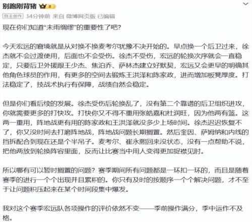 別跑剛背豬則把矛頭指向了麥考爾:今天宏遠(yuǎn)的窘境就是從對換不換麥考爾猶豫不決開始的。早點(diǎn)換一個(gè)后衛(wèi)過來,徐杰就不會(huì)過度使用,后面也不會(huì)受傷。徐杰不受傷,宏遠(yuǎn)的輪換次序就會(huì)一直穩(wěn)定,只要后衛(wèi)外援跟王少杰、焦泊喬、薩林杰建立好默契,宏遠(yuǎn)又會(huì)更早的明確其他角色球員的作用,有更多的空間去鍛煉王洪澤和陳家政,進(jìn)而增加板凳厚度。打法穩(wěn)定了,技戰(zhàn)術(shù)執(zhí)行有保障,戰(zhàn)績自然會(huì)穩(wěn)定。