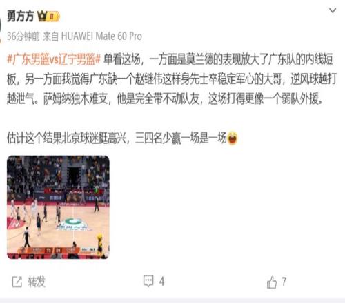 北京媒體人勇方方認(rèn)為廣東缺少了莫蘭德和趙繼偉這樣的內(nèi)外線核心:單看這場,一方面是莫蘭德的表現(xiàn)放大了廣東隊(duì)的內(nèi)線短板,另一方面我覺得廣東缺一個(gè)趙繼偉這樣身先士卒穩(wěn)定軍心的大哥,逆風(fēng)球越打越泄氣。薩姆納獨(dú)木難支,他是完全帶不動(dòng)隊(duì)友,這場打得更像一個(gè)弱隊(duì)外援。