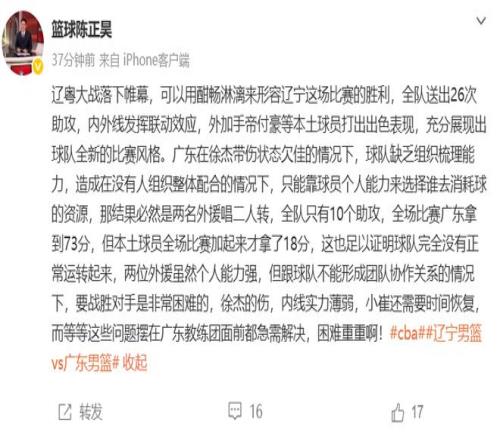 上海的媒體人陳正昊則認(rèn)為徐杰的問題很大:遼寧全隊(duì)送出26次助攻,內(nèi)外線發(fā)揮聯(lián)動(dòng)效應(yīng),外加手帝付豪等本土球員打出出色表現(xiàn),充分展現(xiàn)出球隊(duì)全新的比賽風(fēng)格。