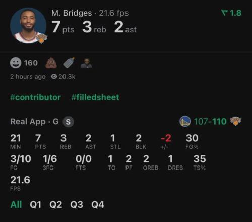 北京時間3月16日,NBA常規賽,尼克斯主場110-107險勝勇士。尼克斯球員米卡爾-布里奇斯首發出戰21分鐘,投籃10中3,三分6中1,得到7分3籃板2助攻1搶斷2蓋帽1失誤2犯規,正負值-2。最近3場比賽,大橋三分合計15中3。