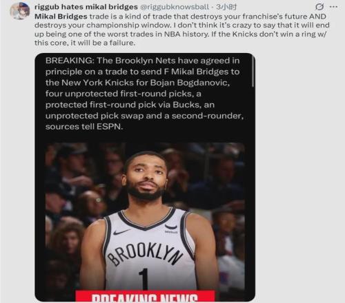 今天有尼克斯球迷在網上開噴:“布里奇斯的交易不僅會毀掉球隊的未來,還會徹底斷送球隊的奪冠窗口期。毫不夸張地說,如果尼克斯最終沒能用這套核心陣容贏得總冠軍,當初那筆交易最終會成為NBA歷史上最糟糕的交易之一?!?/p>