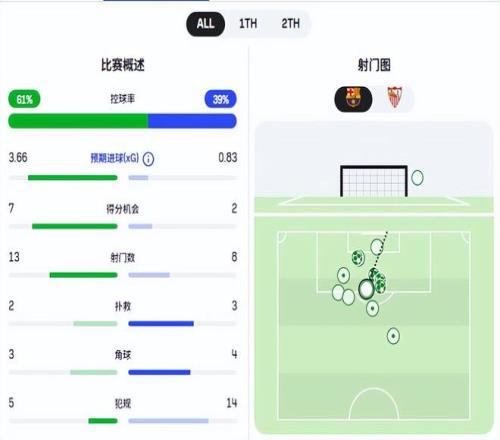 從巴薩5比2擊敗塞維利亞的比賽看,預期進球上巴薩3.66比0.83占據絕對優勢,絕佳得分機會是7比2。