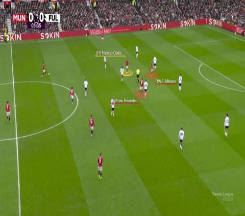 此處,庫尼亞向內切,費爾南德斯向邊線移動,曼聯從右路進攻。隨后阿馬德重新組織攻勢,暫時扮演起“10號位”(中路組織者)的角色,將姆伯莫換位到左側。