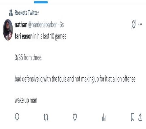 火箭球迷:伊森過去的10場比賽三分球35中3,三分命中率8.6%,防守端能力也差頻繁犯規,進攻端更是一無是處。