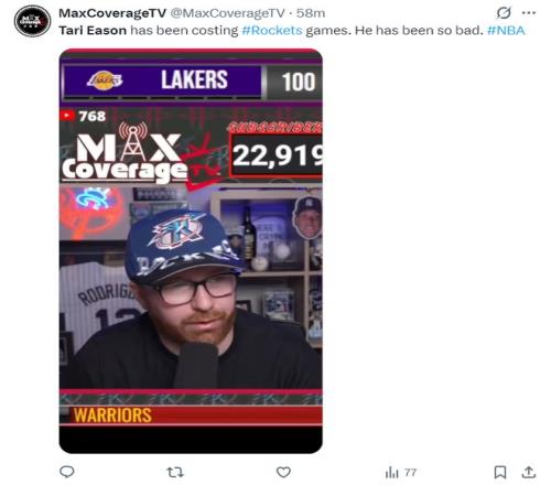 塔里-伊森在對陣湖人的比賽中再度淪為臥底一般的角色,全場比賽33分鐘,11中2,三分3中0,拿到5分9籃板3助攻2搶斷2失誤,命中率18.2%,真實命中率21%,正負值-6。他作為賽季初期火箭最準的三分投手近期的表現陡崖式下滑。