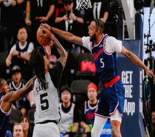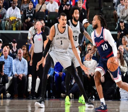 馬刺上一場主場115-102戰(zhàn)勝黃蜂,快船上一場主場109-118輸給國王,本賽季首次交鋒馬刺客場116-112險勝快船完成25分大逆轉。本場馬刺缺少哈珀與科內特,快船缺少萊昂納德、比爾與尼德豪澤。首節(jié)前3分鐘馬刺僅罰球得到1分,被快船內外開花壓制1-13落后,馬刺隨后繼續(xù)被拉開3-17落后。馬刺很快一波8-0攻勢追分,快船連中兩記三分,馬刺沖擊內線追到26-33。快船連得4分擴大11分優(yōu)勢,馬刺追回3分,首節(jié)結束馬刺29-37落后快船。首節(jié)馬刺三分12中1,文班亞馬4中1得到2+3+1;快船三分7中5,加蘭6中4命中2記三分得到10分與馬瑟林8分。