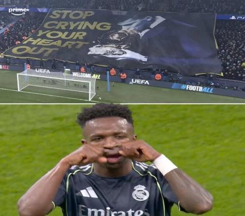 維尼修斯慶祝進球做出哭泣者動作,疑似回應曼城上賽季的Tifo 懂球帝 2026-03-18 08:48:30 本賽季歐冠1/8決賽次回合,皇馬客場對陣曼城,上半場以1-1結束,目前兩回合皇馬4-1領先曼城。維尼修斯在比賽第22分鐘造點,曼城中場伯納多-席爾瓦被紅牌罰下,在打入點球后,維尼修斯用帶有回應意味的慶祝動作宣泄情緒。進球后做出“讓你哭”的慶祝,疑似是在回應曼城球迷上賽季為他準備的以羅德里金球獎為主體的Tifo,同時配有文字:別再傷心哭泣了。現年25歲的維尼修斯本賽季已為皇馬各項賽事出場42次,其中38次首發,已打入14球和送出9次助攻,目前德轉身價1.5億歐。【上咪咕獨家看英超】曼城免費觀看_席爾瓦免費觀看_英超聯賽免費觀看_曼城高清在線_席爾瓦高清在線_英超聯賽高清在線 曼城 席爾瓦 英超聯賽 皇家馬德里 維尼修斯·儒尼奧爾 上一篇: 15球,維尼修斯代表皇馬歐冠淘汰賽進球追平勞爾并列隊史第三 下一篇: 維尼修斯在阿韋洛亞麾下15場打入8球,超過阿隆索時代33場7球