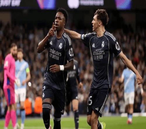 皇馬沒給曼城任何機會。首回合3-0領先已占先機,次回合開場22分鐘,B席門線手球送點+紅牌,維尼修斯一蹴而就。盡管多庫助攻哈蘭德扳回一城,但少打一人的藍月軍團難挽頹勢。下半場姆巴佩傷愈替補登場,維尼修斯讀秒再下一城,完成梅開二度。最終皇馬2-1再勝,總比分5-1淘汰衛冕冠軍,劍指第16座大耳朵杯。