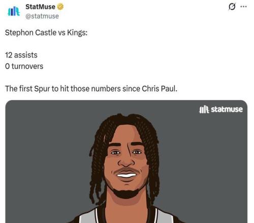 7名得分上雙的球員中還不包括卡斯爾,本場他7中1失準,但狂送12次助攻并且一次失誤都沒有,憑借這樣的表現,卡斯爾成為保羅之后馬刺首位單場做到12助0失誤的球員。