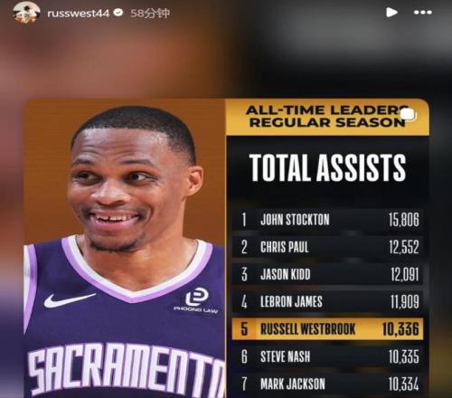 憑借這樣的表現,威少生涯總助攻數成功超越馬克-杰克遜和納什升至NBA歷史第五,賽后威少本人也轉發多條動態慶祝。