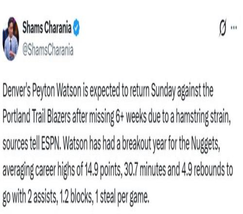 掘金前鋒佩頓-沃特森因右腿腿筋拉傷缺席六周多后,預計將在周一對陣波特蘭的比賽中復出、可以登場。