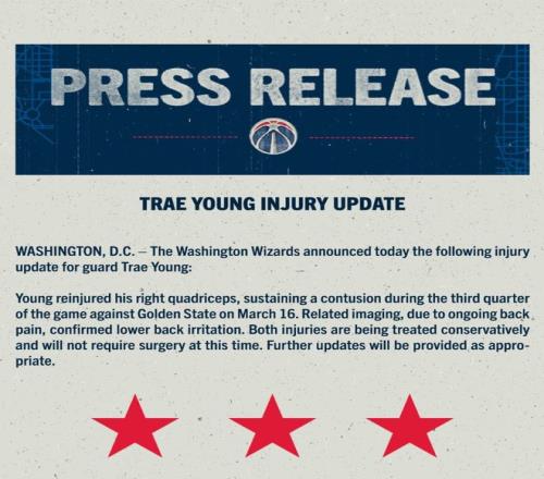 奇才隊官方宣布,楊在周一對陣金州勇士的比賽第三節中右股四頭肌再次受傷,出現挫傷。隊記羅賓斯透露,因持續背痛進行的影像學檢查,同時確認他存在下背部刺激癥狀。奇才隊補充道,兩處傷病目前均采用保守治療,現階段無需手術。美媒報道稱,考慮到奇才的擺爛以及常規賽余下時間不多,特雷-楊基本賽季報銷。